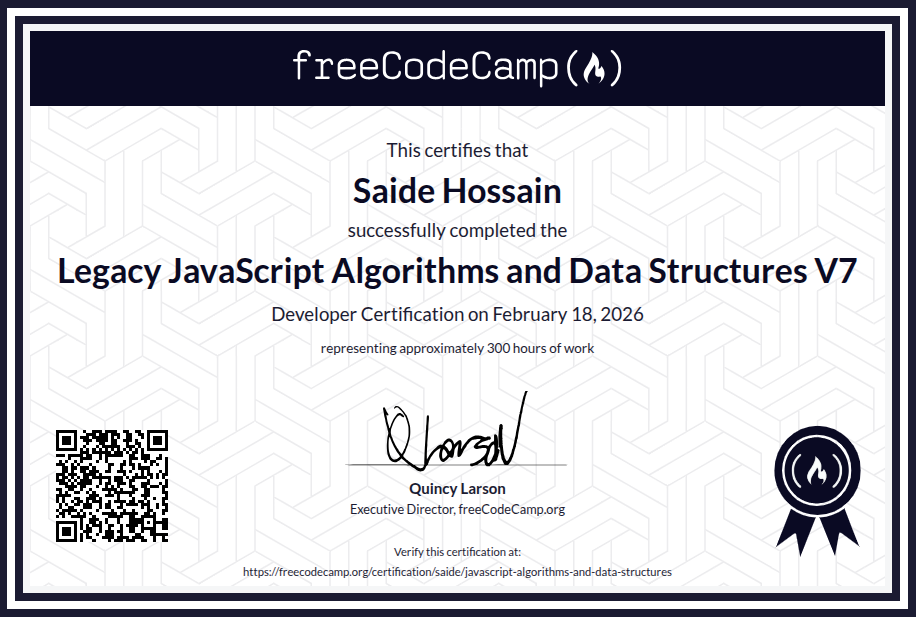 I’m excited to share that I’ve successfully earned the Legacy JavaScript Algorithms and Data Structures V7 Developer Certification from freeCodeCamp!
