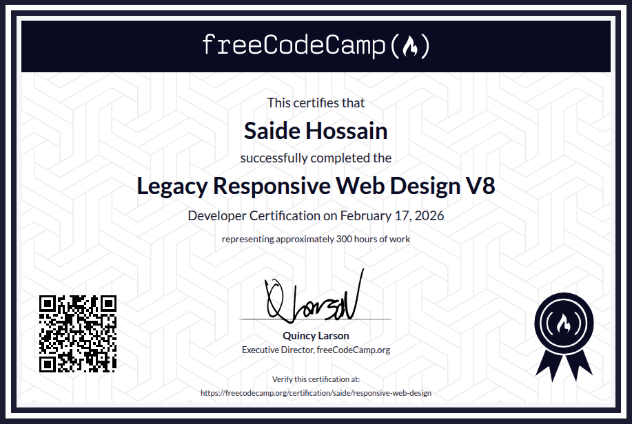 On February 17, 2026, I earned the Legacy Responsive Web Design (V8) Developer Certification from freeCodeCamp, completing approximately 300 hours of hands-on development.